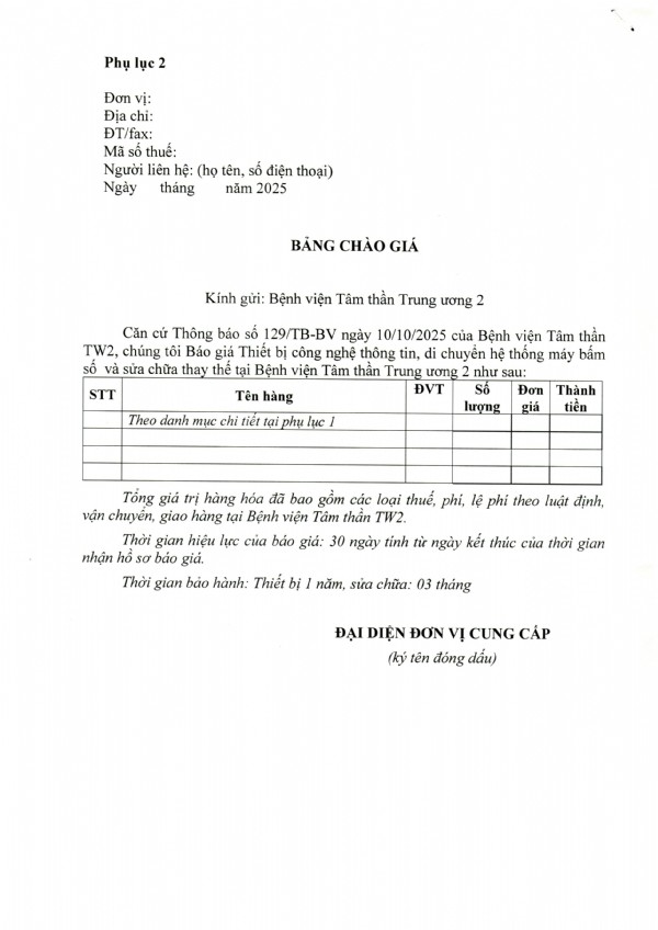 Mời chào giá cung cấp biểu mẫu chuyên môn của Bệnh viện Tâm thần Trung ương 2