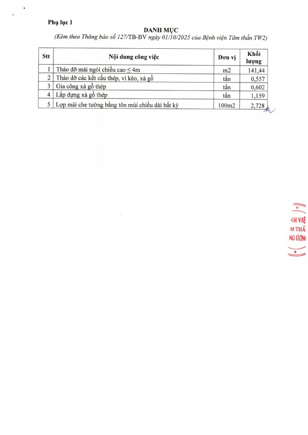Mời chào giá thực hiện sữa chữa mái nhà Khoa Y học cổ truyền tại Bệnh viện Tâm thần Trung ương 2