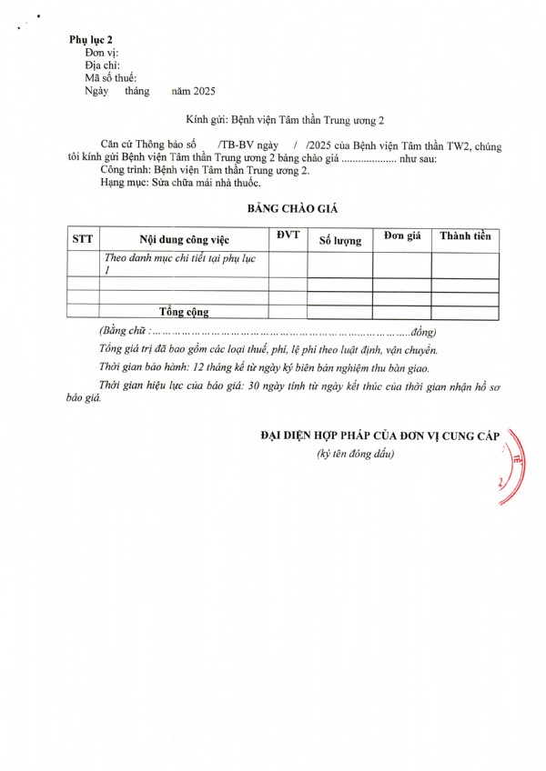 Mời chào giá cung cấp biểu mẫu chuyên môn của Bệnh viện Tâm thần Trung ương 2