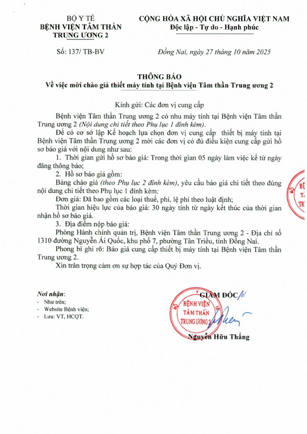 Mời chào giá thiết bị máy tính tại Bệnh viện Tâm thần Trung ương 2