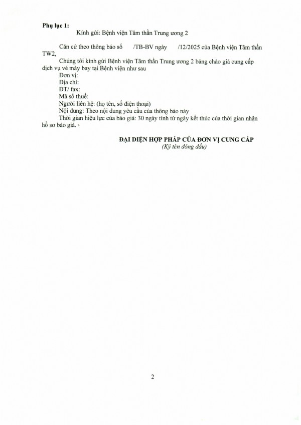 Mời chào giá dịch vụ vé máy bay tại Bệnh viện Tâm thần Trung ương 2