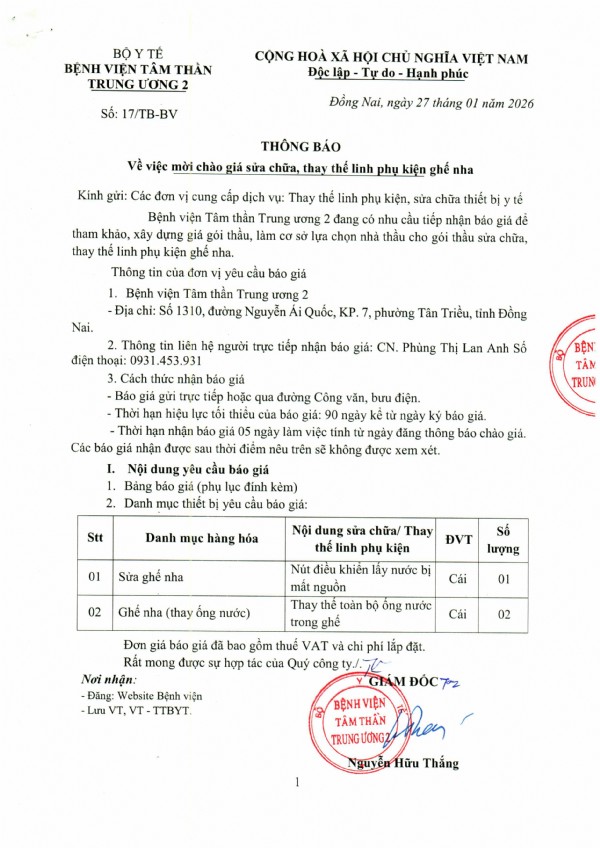 Mời chào giá thực hiện sửa chữa nhà vệ sinh nhân viên Khoa lạm dụng chất và hành vi tại Bệnh viện Tâm thần Trung ương 2