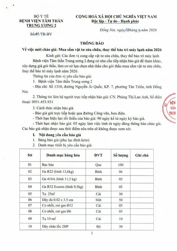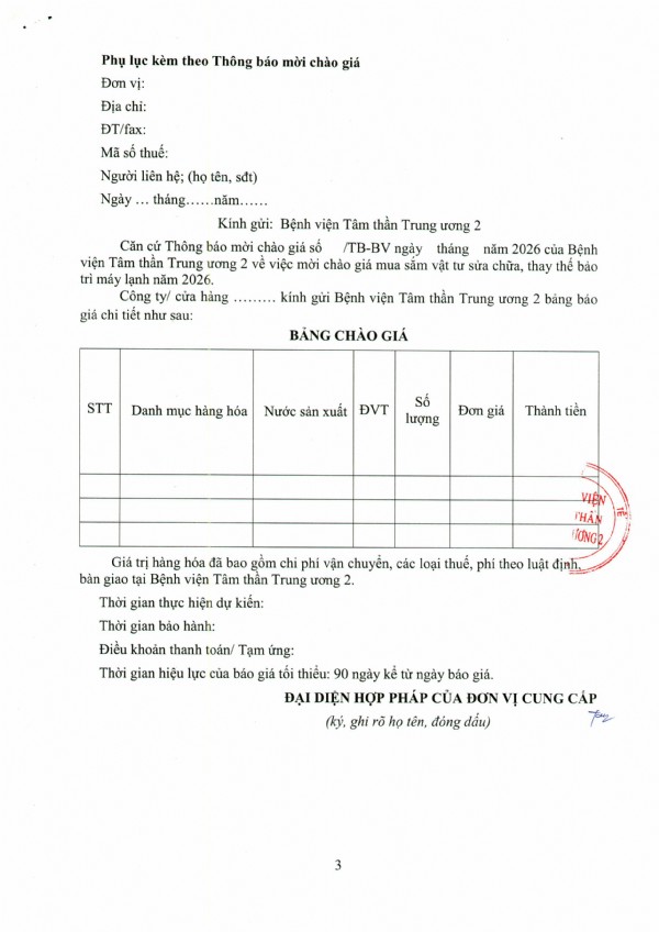 Mời chào giá máy in, máy in màu, máy Scan, màn hình máy vi tính, thùng CPU và linh kiện máy vi tính tại Bệnh viện Tâm thần Trung ương 2