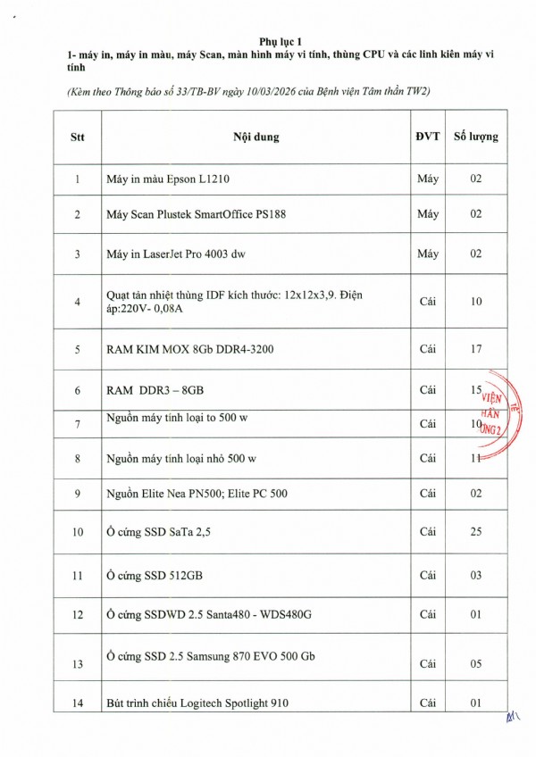 Mời chào giá máy in, máy in màu, máy Scan, màn hình máy vi tính, thùng CPU và linh kiện máy vi tính tại Bệnh viện Tâm thần Trung ương 2