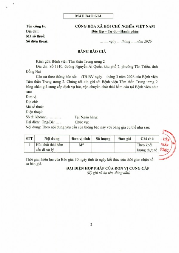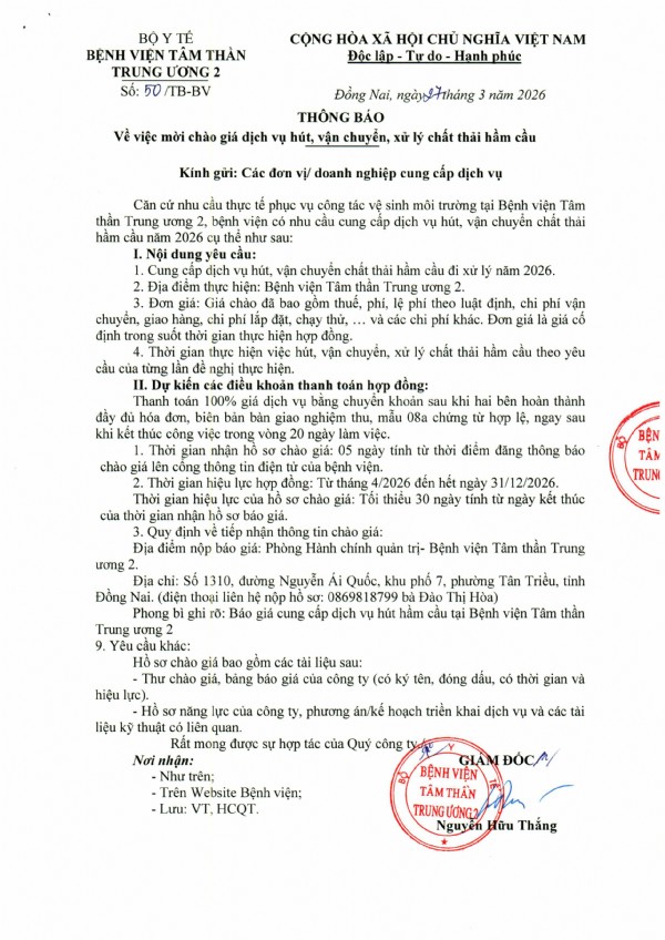 Mời chào giá cung in phiếu thu của Bệnh viện Tâm thần Trung ương 2