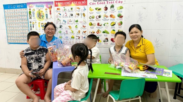 Những chiếc bánh kẹo đủ màu sắc, tan chảy vị ngọt trên đầu lưỡi, cùng hộp sữa ấm áp nuôi dưỡng cơ thể và tâm hồn, được gói ghém tỉ mỉ như những lời thì thầm yêu thương. Các bé, thường e ấp trong thế giới riêng, hôm nay reo vui ôm chặt quà tặng, ánh mắt lấp lánh như sao trời.