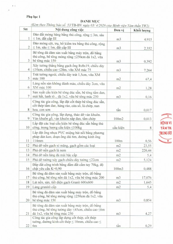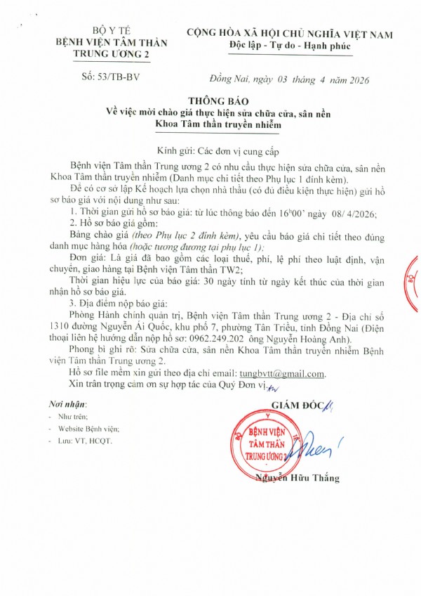 Thông báo Về việc mời chào giá thực hiện sửa chữa cửa, sân nền Khoa Tâm thần truyền nhiễm