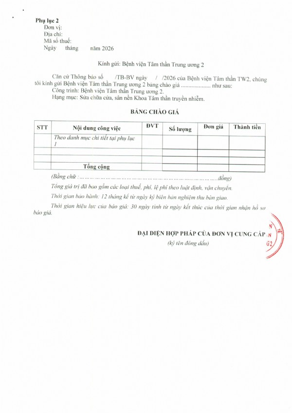 Thông báo Về việc mời báo giá chi phí Thuê tư vấn lập báo cáo kinh tế - kỹ thuật nâng cấp hạ tầng công nghệ thông tin tại Bệnh viện Tâm thần Trung ương 2
