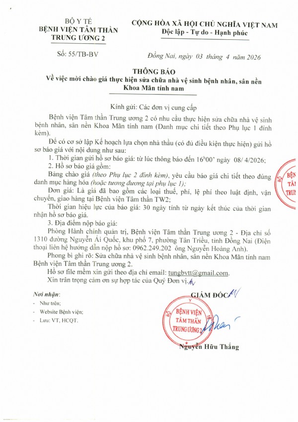 Thông báo Về việc mời chào giá cung cấp dịch vụ phun hóa chất diệt côn trùng trong khuôn viên Bệnh viện Tâm thần Trung ương 2