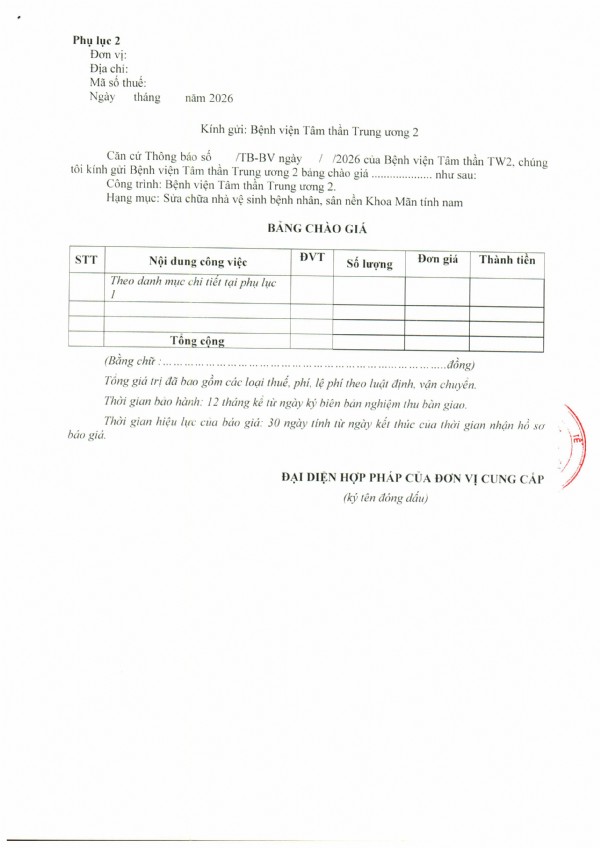 Thông báo Về việc mời báo giá chi phí Thuê tư vấn lập báo cáo kinh tế - kỹ thuật nâng cấp hạ tầng công nghệ thông tin tại Bệnh viện Tâm thần Trung ương 2