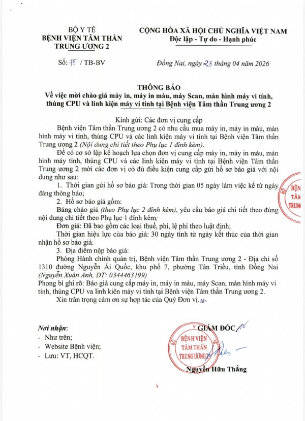 Chào giá máy in, máy in màu, máy Scan, màn hình máy tính, thùng CPU và linh kiện máy tính tại Bệnh viện Tâm thần Trung ương 2