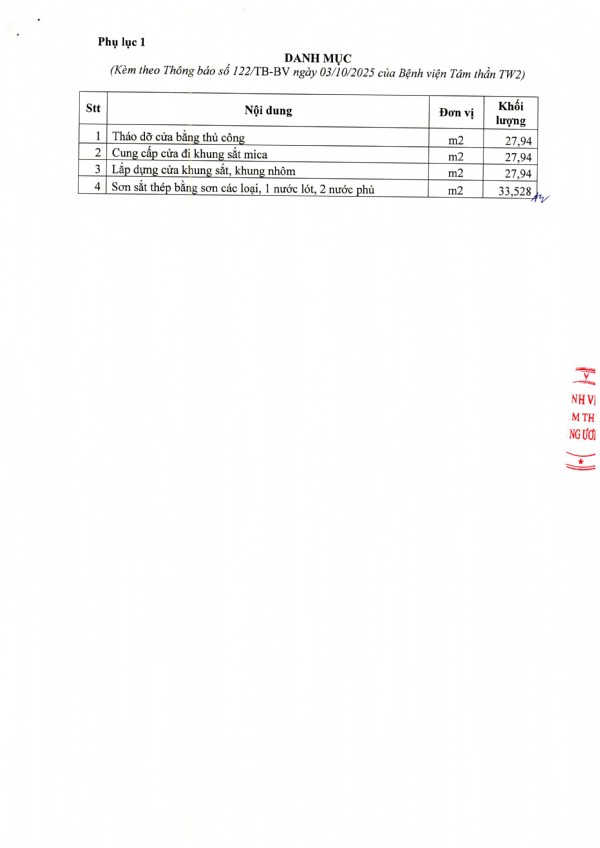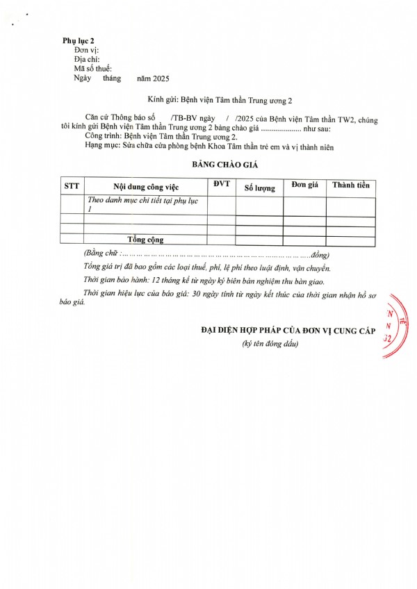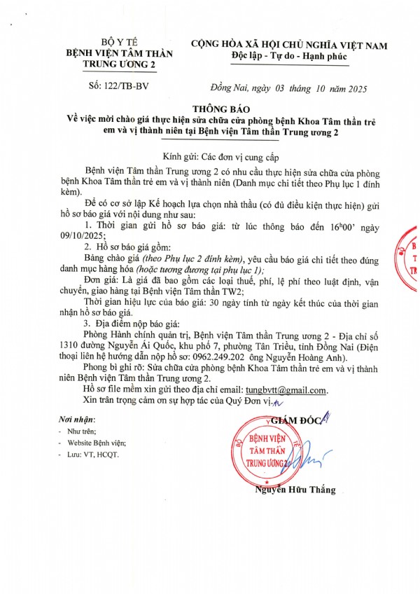 Mời chào giá sữa chữa cửa phòng bệnh Khoa Tâm thần trẻ em và vị thành niên tại Bệnh viện Tâm thần Trung ương 2