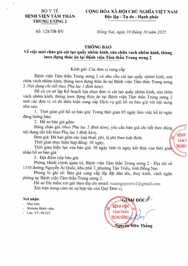 Mời chào giá cung cấp sữa chữa thay thế thiết bị công nghệ thông tin tại Bệnh viện Tâm thần Trung ương 2