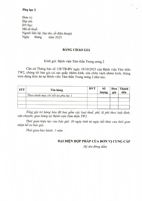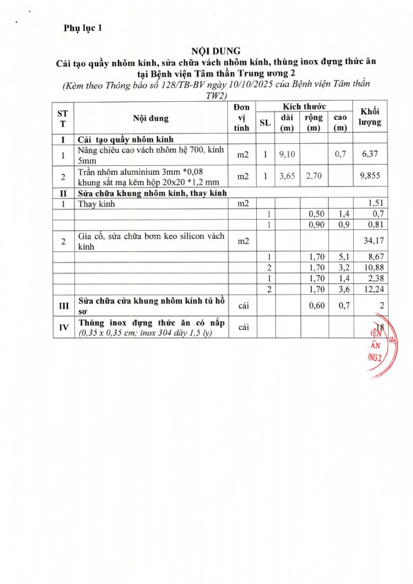 Mời chào giá cải tạo quầy nhôm kính, sữa chữa vách nhôm kính, thùng inox đựng thức ăn tại Bệnh viện Tâm thần Trung ương 2