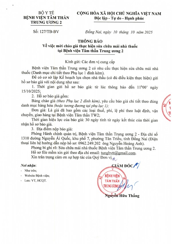 Mời chào giá cung cấp sữa chữa thay thế thiết bị công nghệ thông tin tại Bệnh viện Tâm thần Trung ương 2