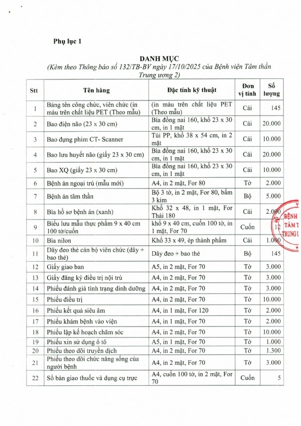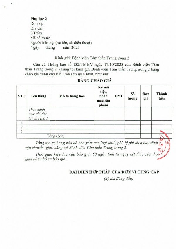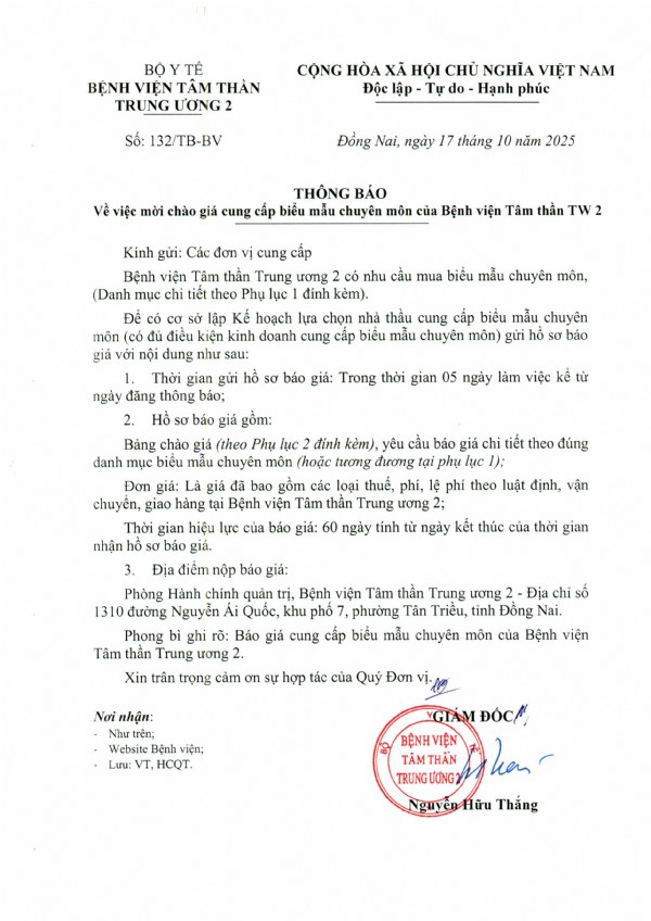 Mời chào giá cung cấp biểu mẫu chuyên môn của Bệnh viện Tâm thần Trung ương 2