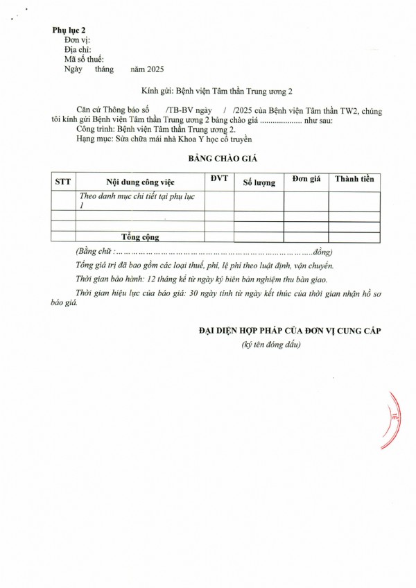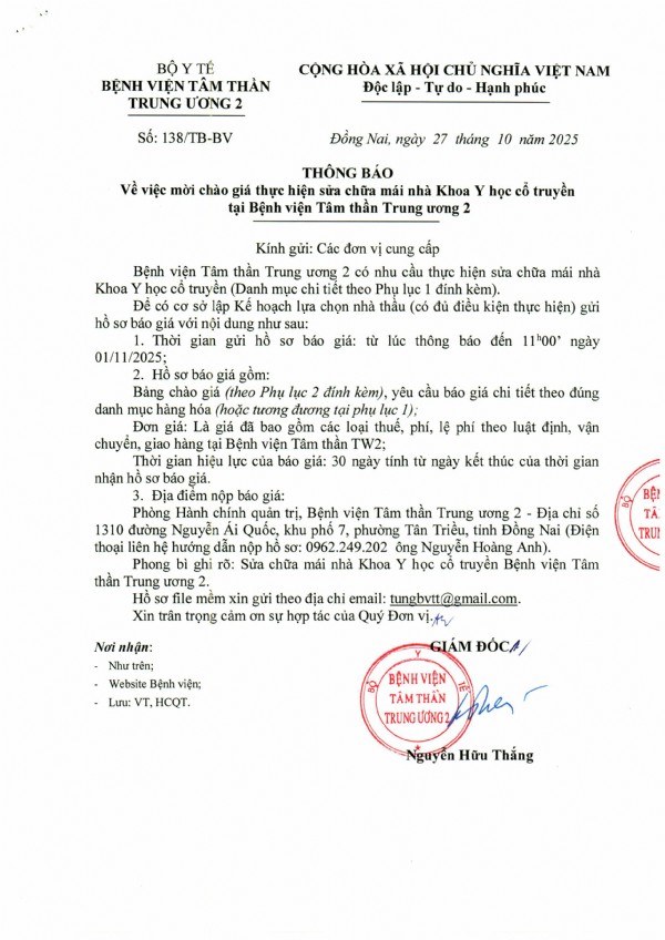 Mời chào giá thực hiện sữa chữa mái nhà Khoa Y học cổ truyền tại Bệnh viện Tâm thần Trung ương 2