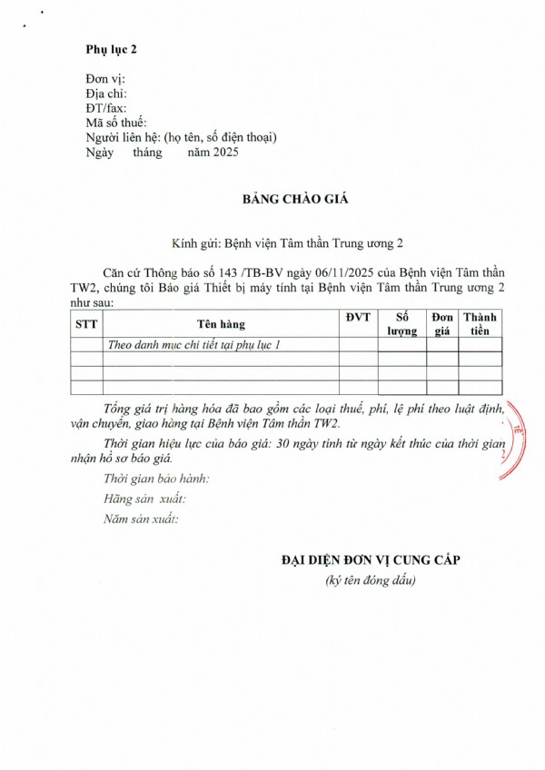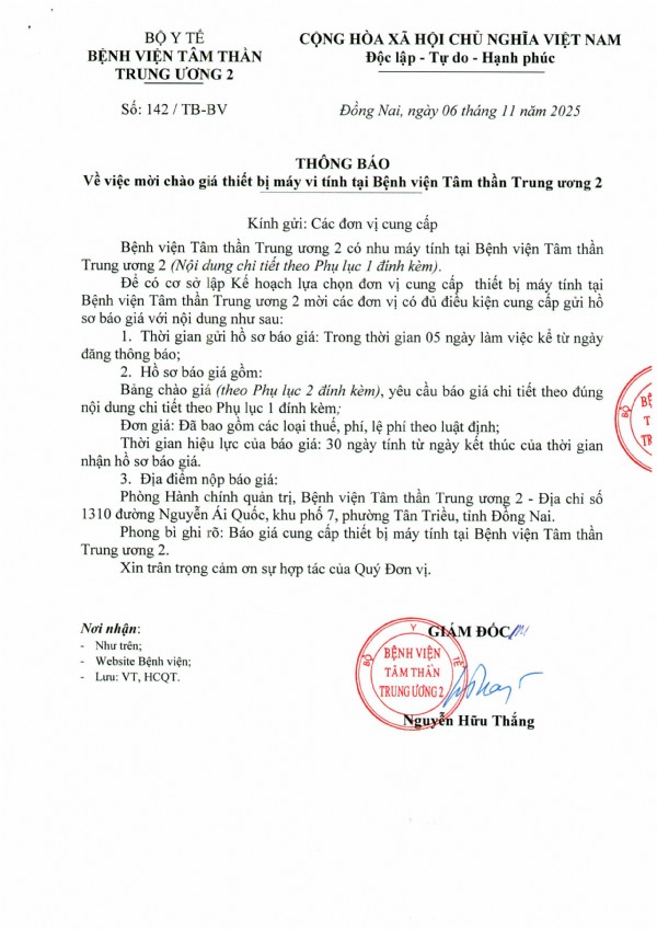 Mời chào giá thiết bị máy tính tại Bệnh viện Tâm thần Trung ương 2