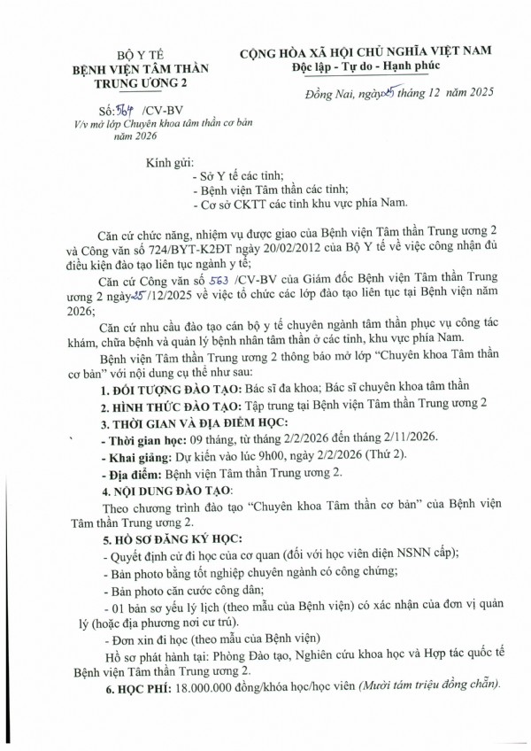 Mở lớp chuyên khoa Tâm thần cơ bản năm 2026