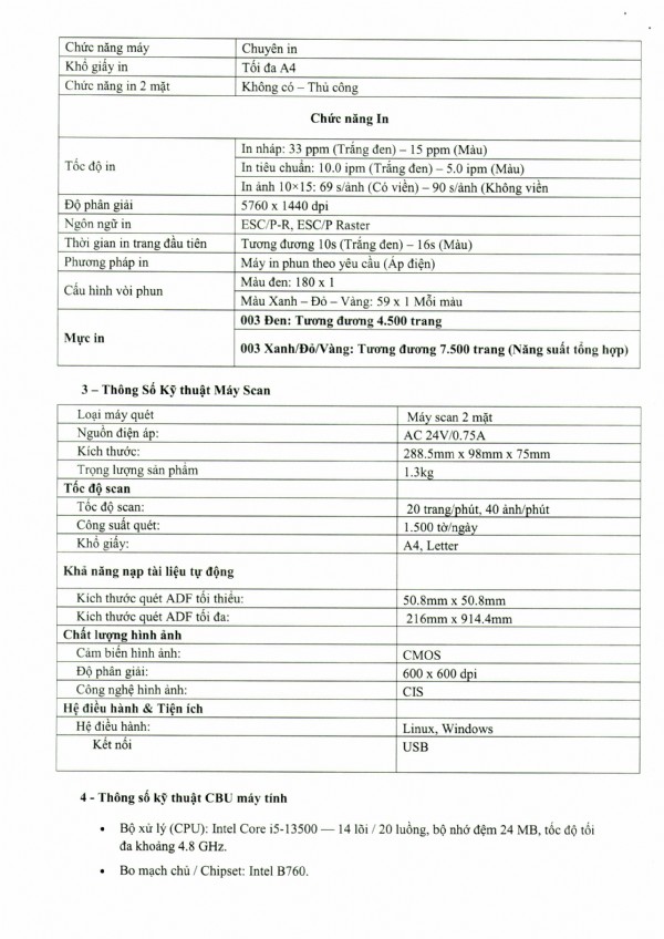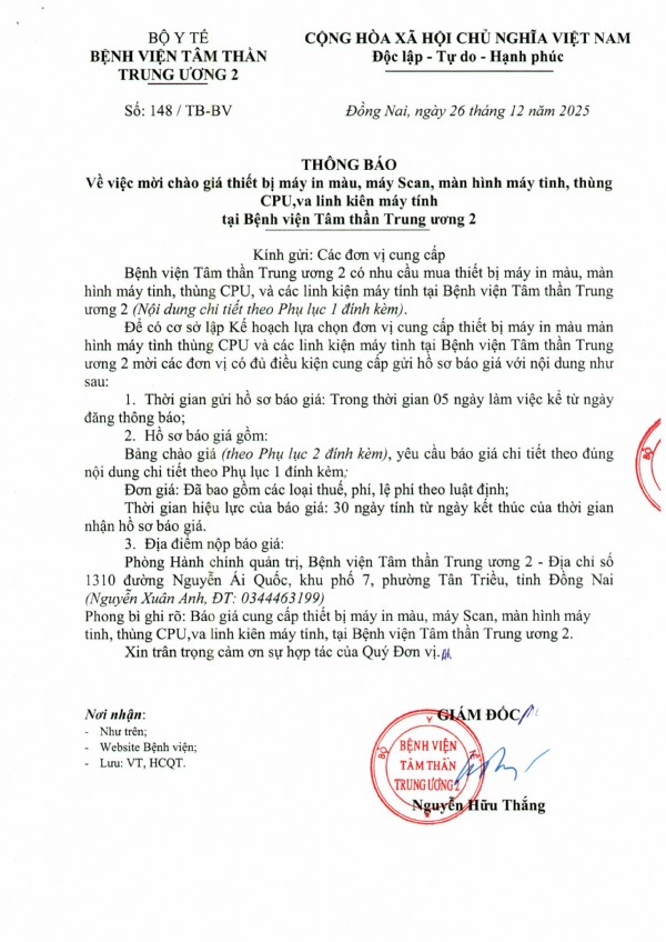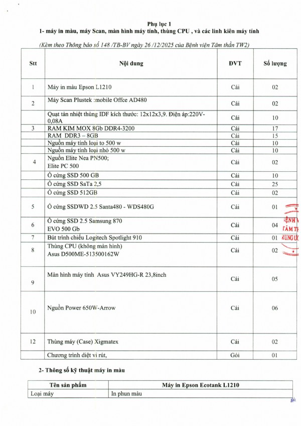 Mời chào giá thiết bị máy in màu, máy Scan, màn hình máy tính, thùng CPU và linh kiện máy tính tại Bệnh viện Tâm thần Trung ương 2