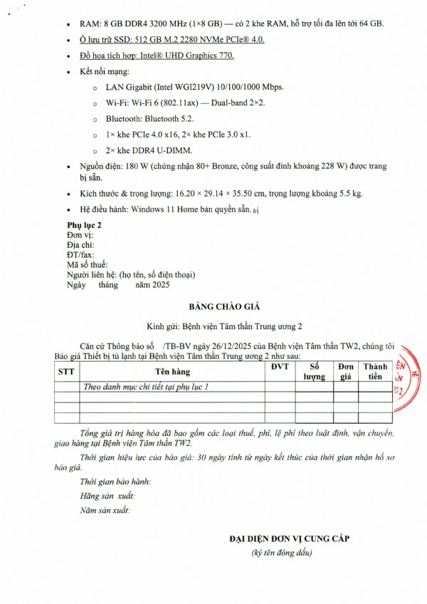 Mời chào giá cung cấp sữa chữa thay thế thiết bị công nghệ thông tin tại Bệnh viện Tâm thần Trung ương 2