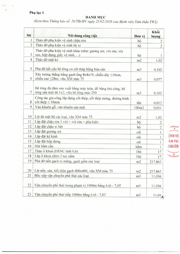 Mời chào giá thực hiện sửa chữa nhà làm việc Tổ xe tại Bệnh viện Tâm thần trung ương 2