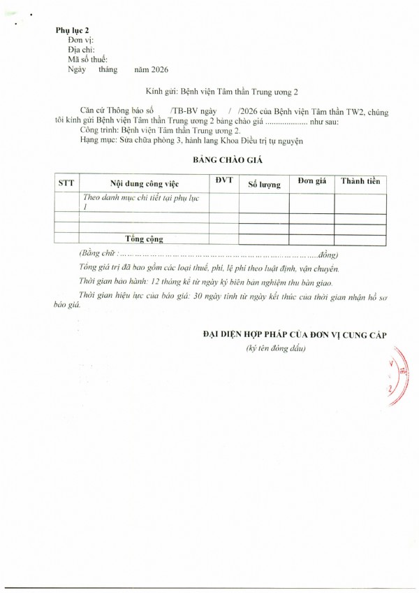 Mời chào giá thực hiện sữa chữa phòng 3, hành lang Khoa Điều trị tự nguyện tại Bệnh viện Tâm thần trung ương 2