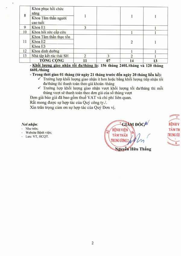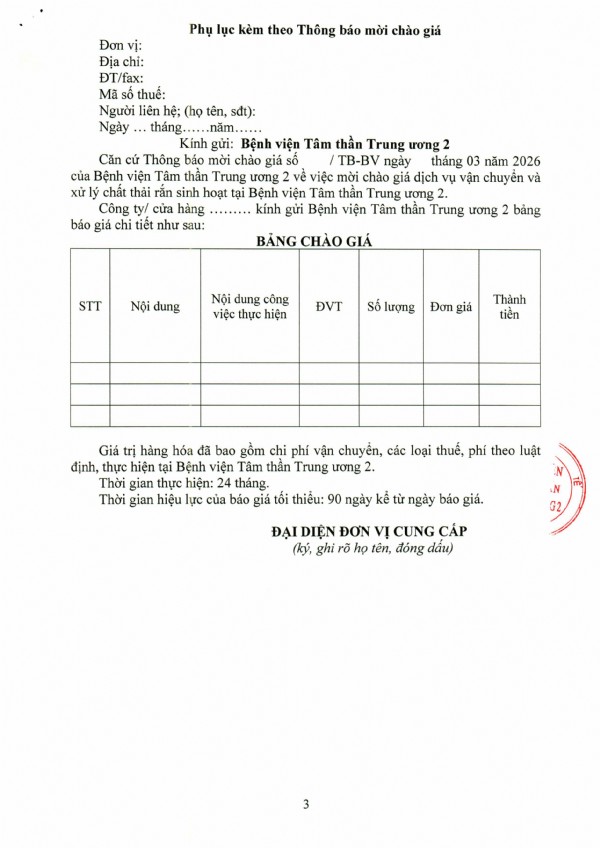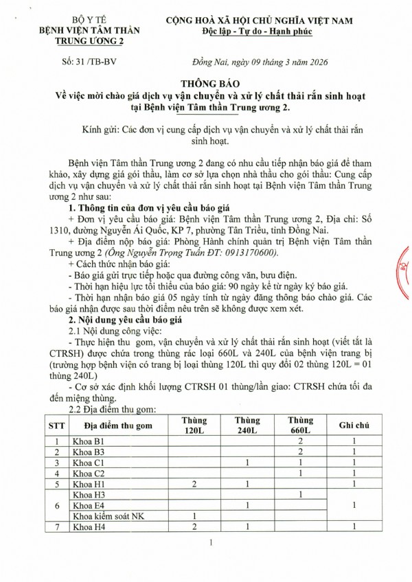 Mời chào giá dịch vụ vận chuyển và xử lý chất thải rắn sinh hoạt tại Bệnh viện Tâm thần Trung ương 2