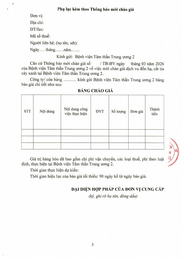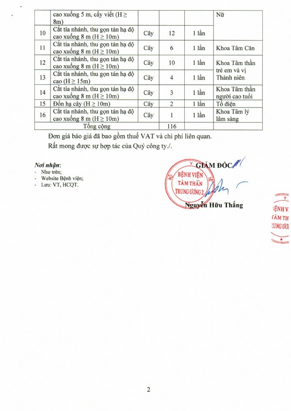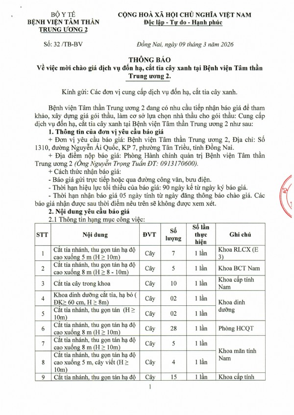 Mời chào giá dịch vụ đốn hạ, cắt tỉa cây xanh tại Bệnh viện Tâm thần Trung ương 2
