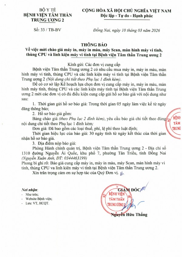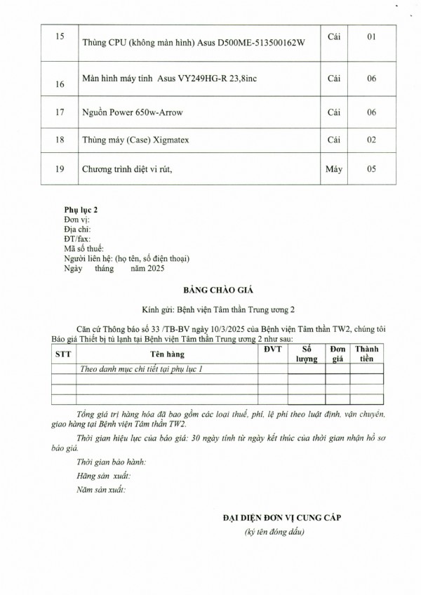 Mời chào giá máy in, máy in màu, máy Scan, màn hình máy vi tính, thùng CPU và linh kiện máy vi tính tại Bệnh viện Tâm thần Trung ương 2